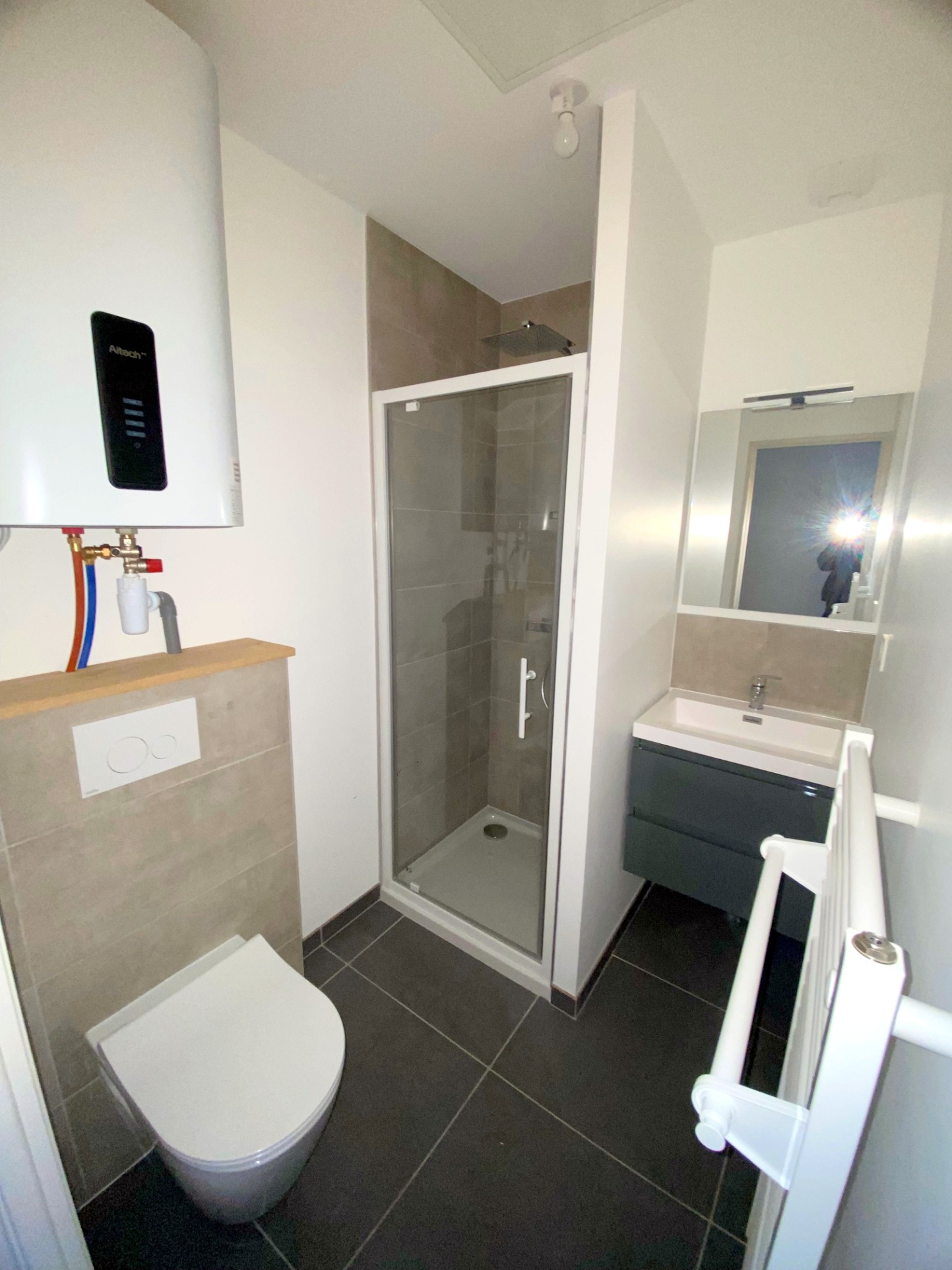 L'appartement comprend une salle d'eau avec wc, un espace cuisine aménagée et équipée sur séjour et une chambre